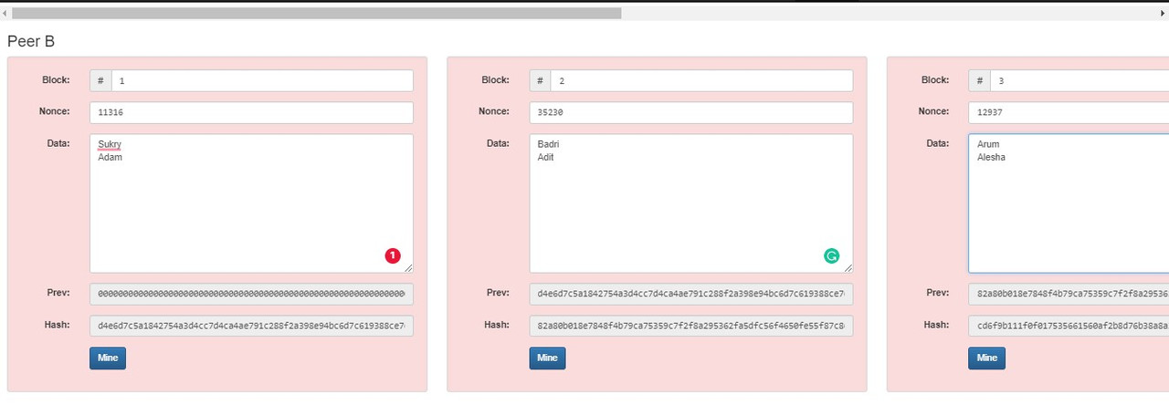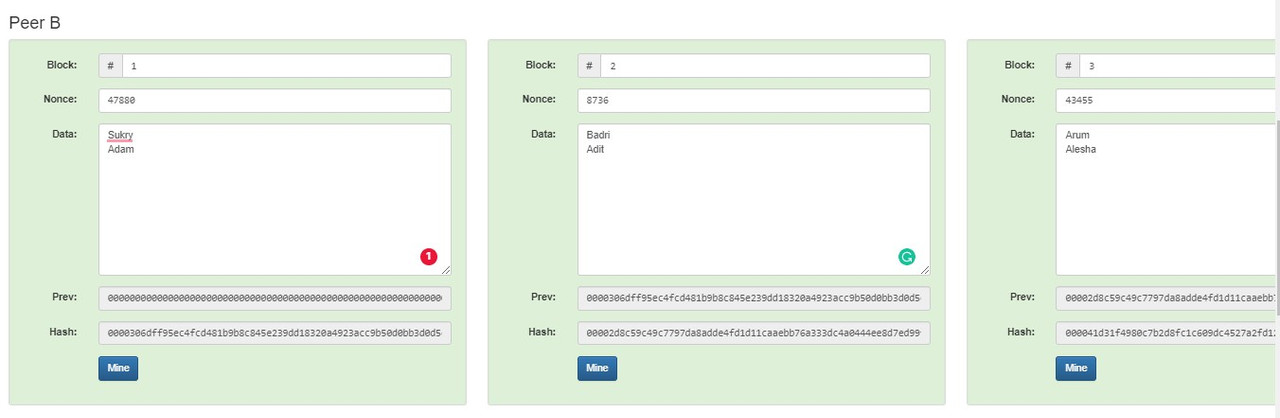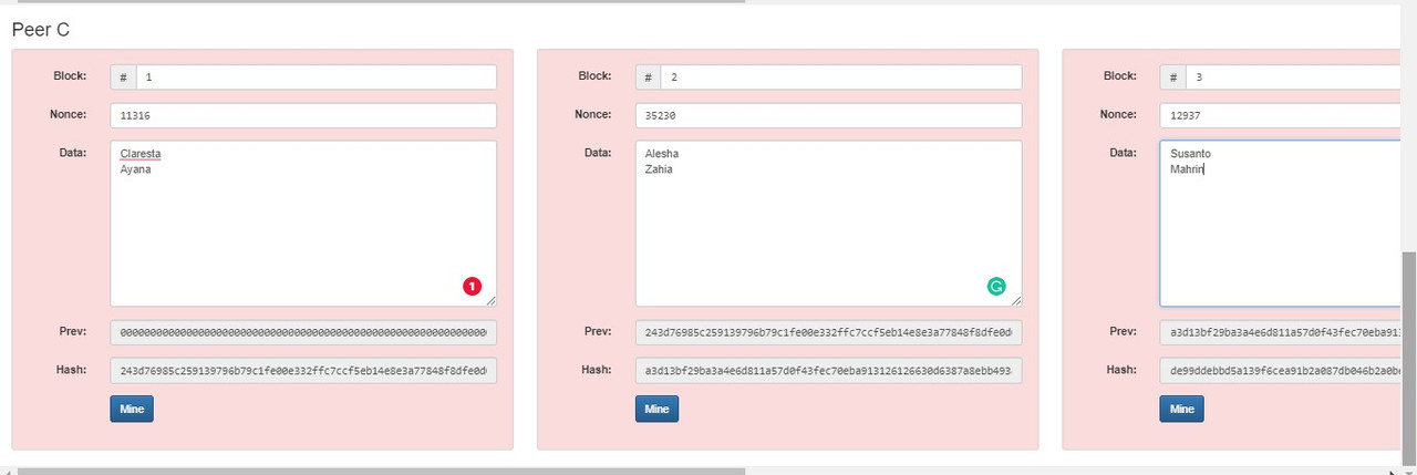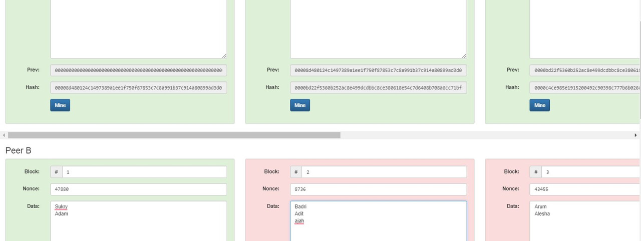 Contoh jika ada salah 1 data yang diubah pada block 2 Peer B maka:
