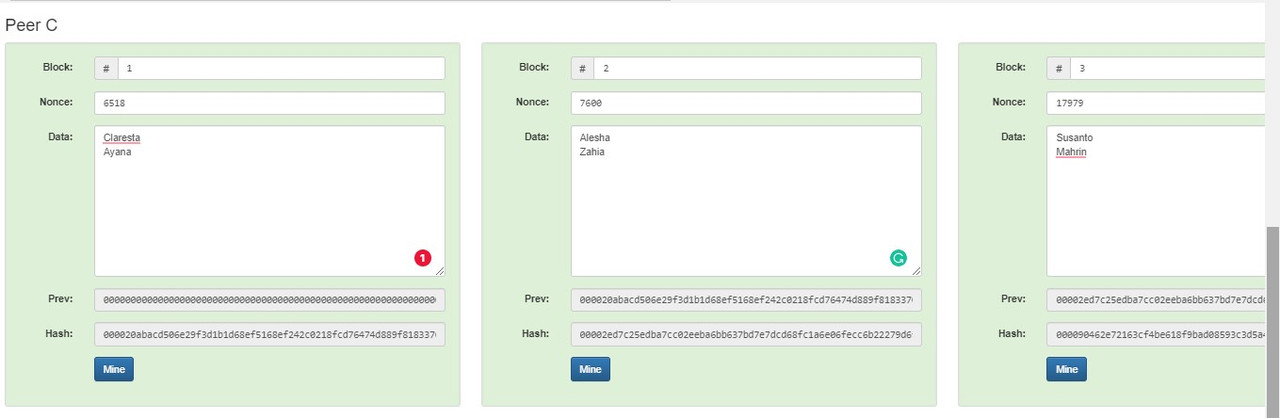 Percobaan pertama adalah dengan memasukan masing-masing 2 nama pada setiap block di Peer A- Peer B dan Peer C