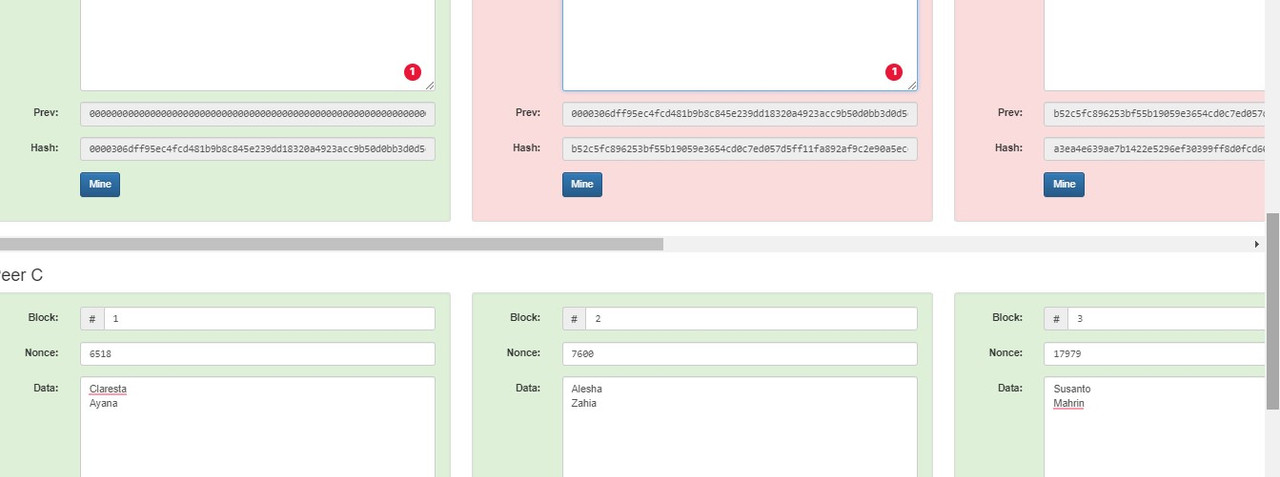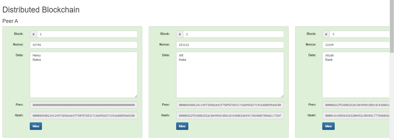 Didalam menu Distributed, isikan nama dari teman masing masing, sama persis seperti yang ada di tantangan nomor 3, masukan kedalam masing masing peer. didalam masing masing block terdiri dari minimal 2 nama. Pastikan semua block dalam keadaan hijau, yang artinya block tersambung dengan baik secara distributed.