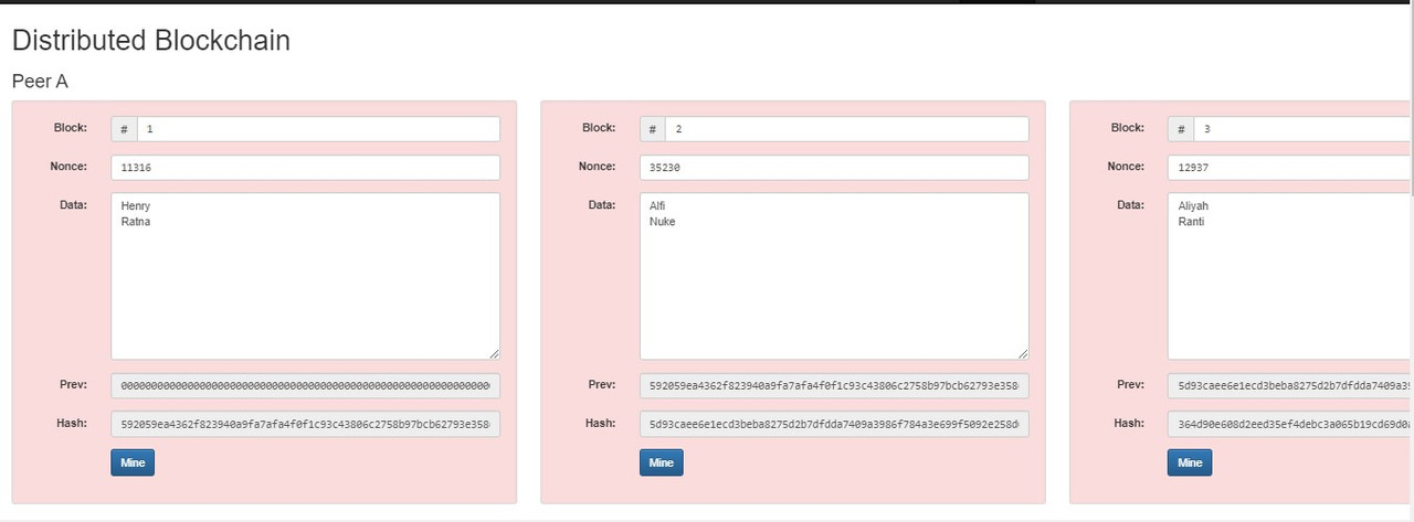 Setelah penginputan 2 nama tiap block terlihat warna tiap block yang masih merah yang artinya belum terkoneksi / terenkripsi tiap blocknya.