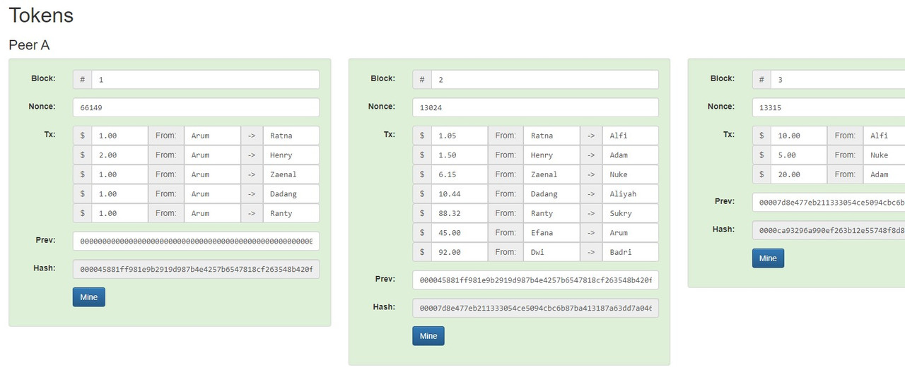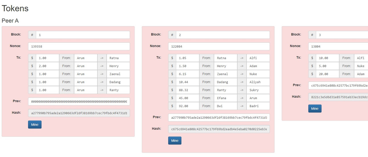 Pada menu Tokens, masukan transaksi dengan teman masing masing dengan nilai transaksi yang sesuai dengan yang diinginkan (apa saja boleh), perhatikan dan catat Nonce dan hash yang terbentuk.