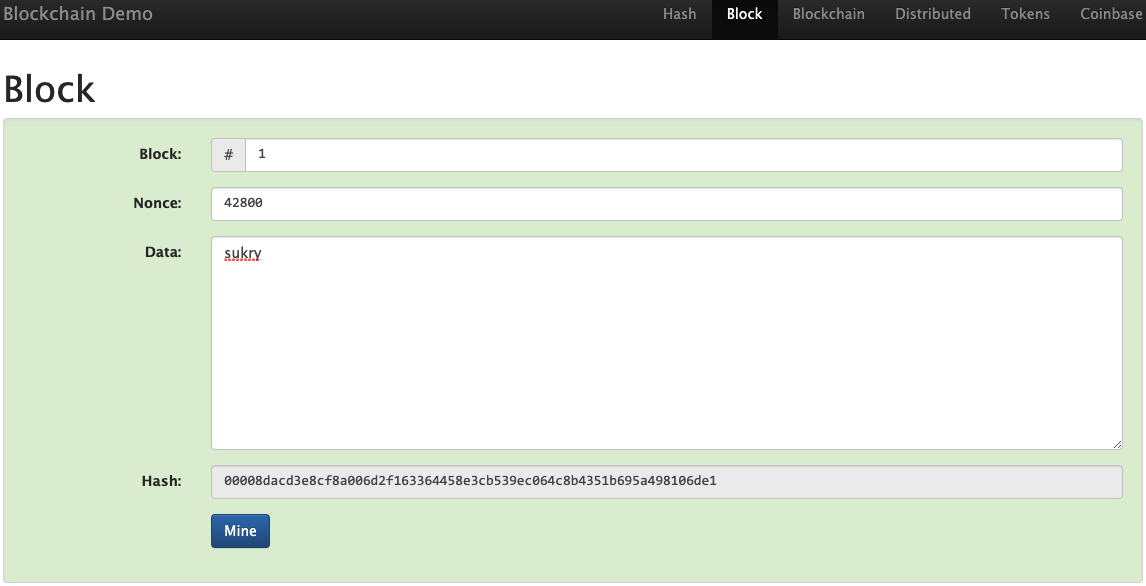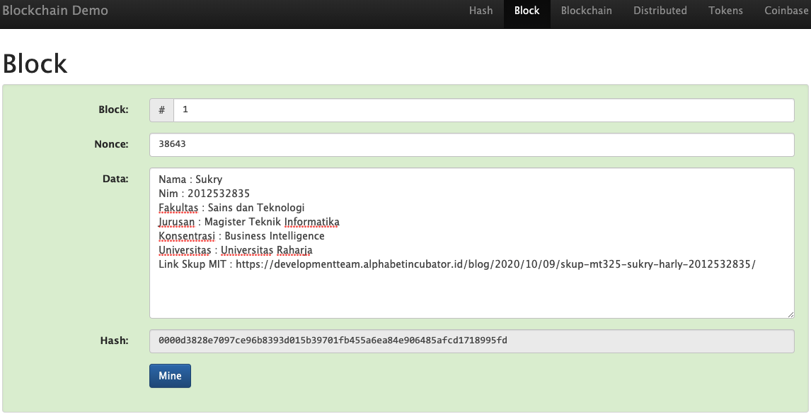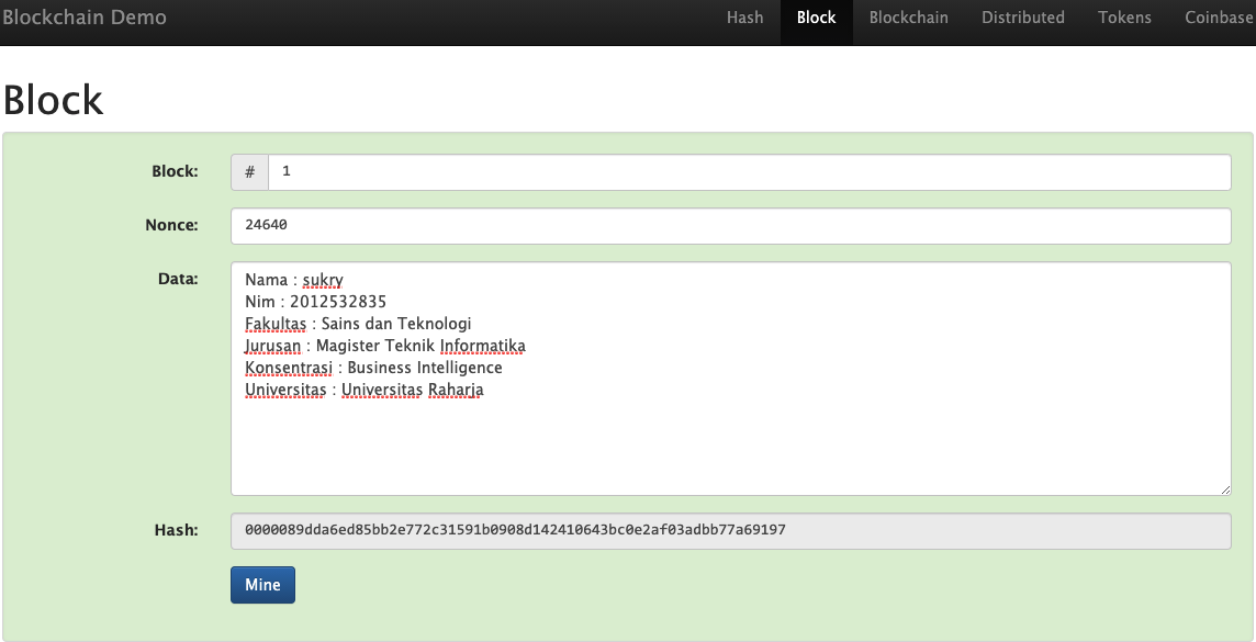 2. Didalam menu Block, Lakukan mining dari masing masing 4 tantangan dibawah ini, sebutkan dari masing masing nonce dan hash yang didapat.