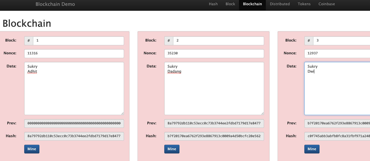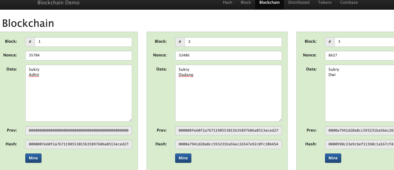 - Didalam menu Blockchain, isikan nama dari teman masing masing, masukan kedalam block, didalam masing masing block terdiri dari minimal 2 nama. Pastikan semua block dalam keadaan hijau, yang artinya block tersambung dengan baik.