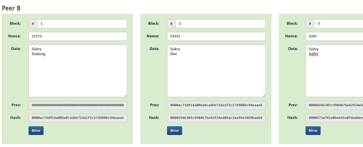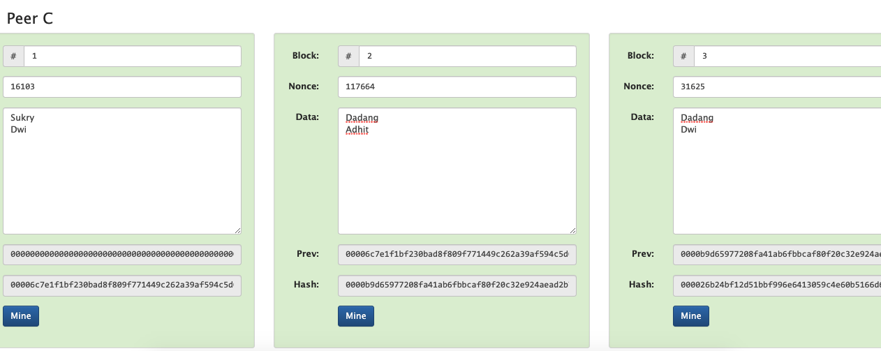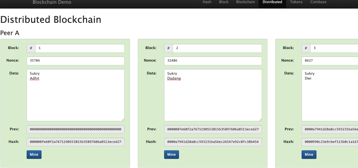 Didalam menu Distributed, isikan nama dari teman masing masing, sama persis seperti yang ada di tantangan nomor 3, masukan kedalam masing masing peer. didalam masing masing block terdiri dari minimal 2 nama. Pastikan semua block dalam keadaan hijau, yang artinya block tersambung dengan baik secara distributed.