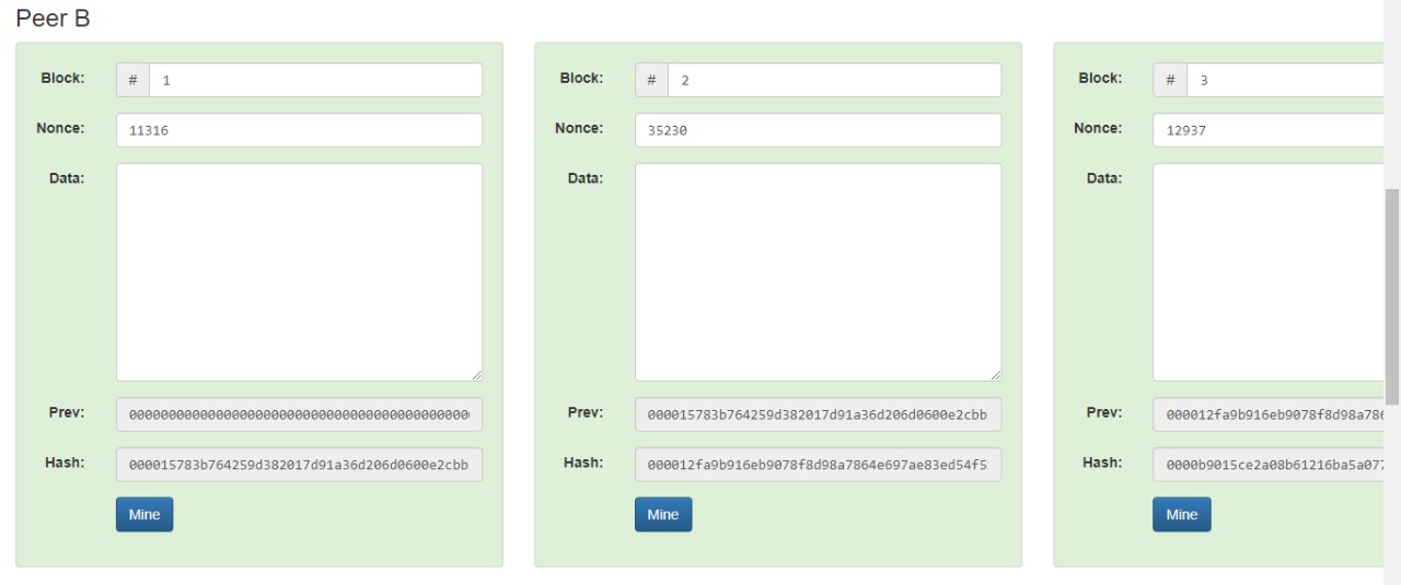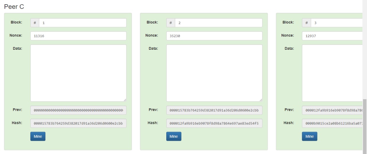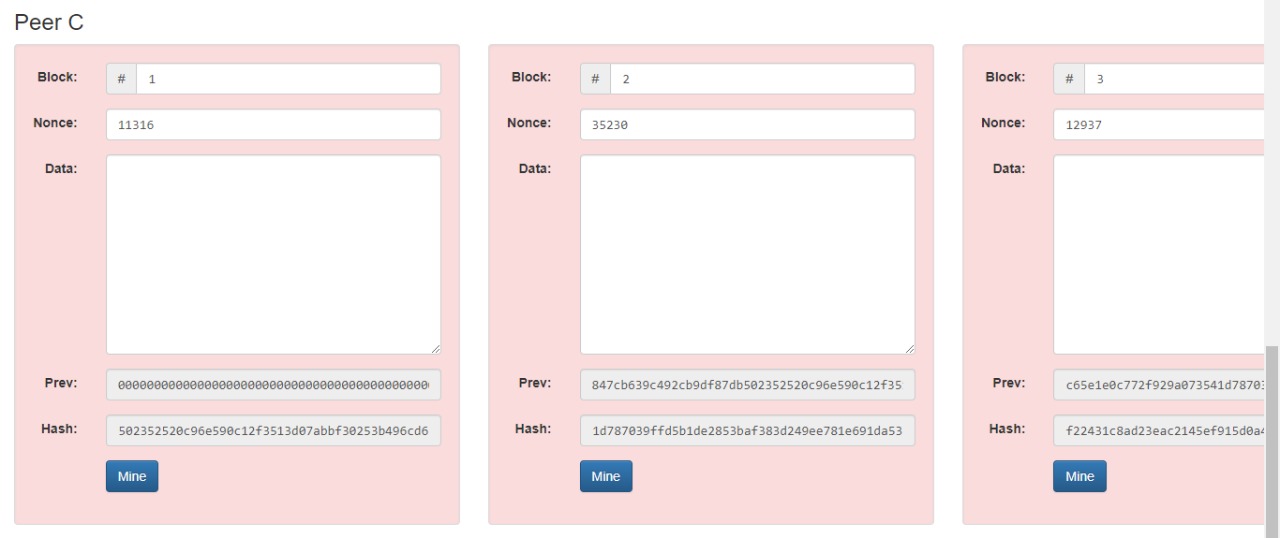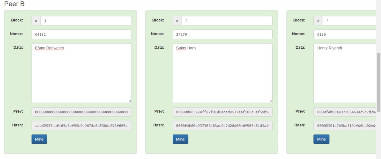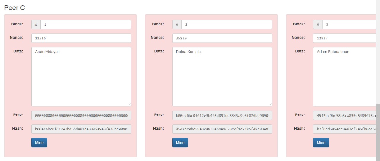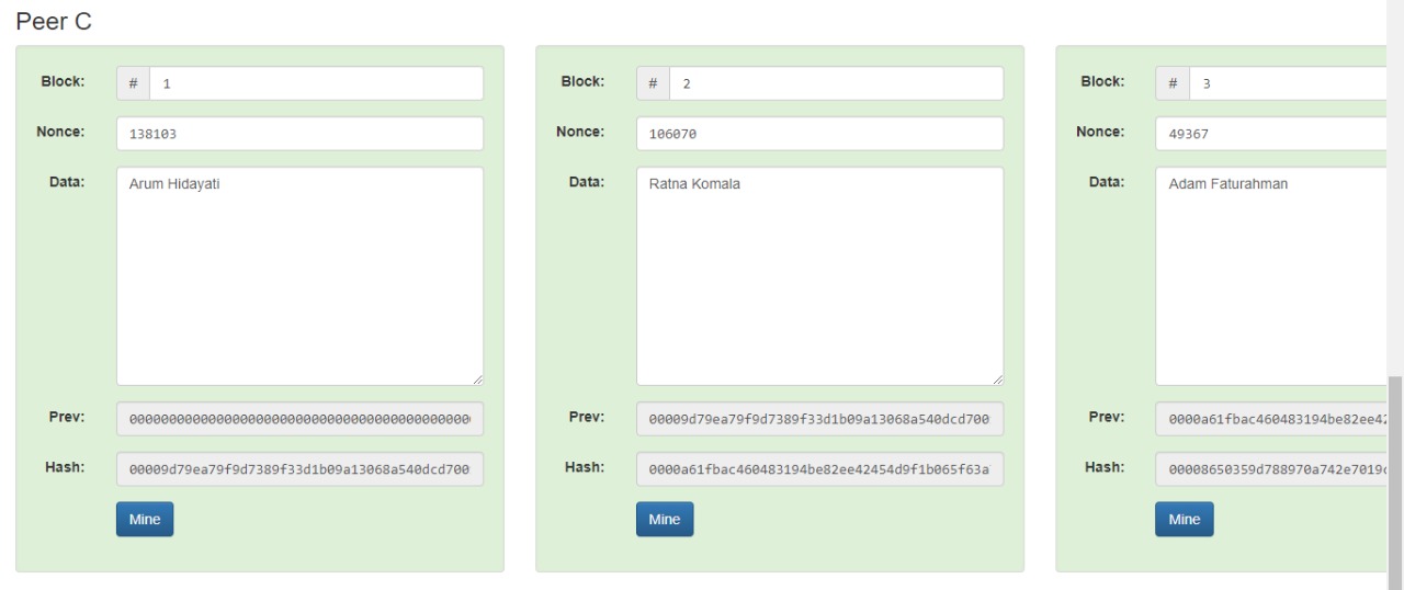 dan masih dengan cara peer B, badri mengisi semua Block yang ada di Peer C. dan masing masing sudah diberikan hash baru.