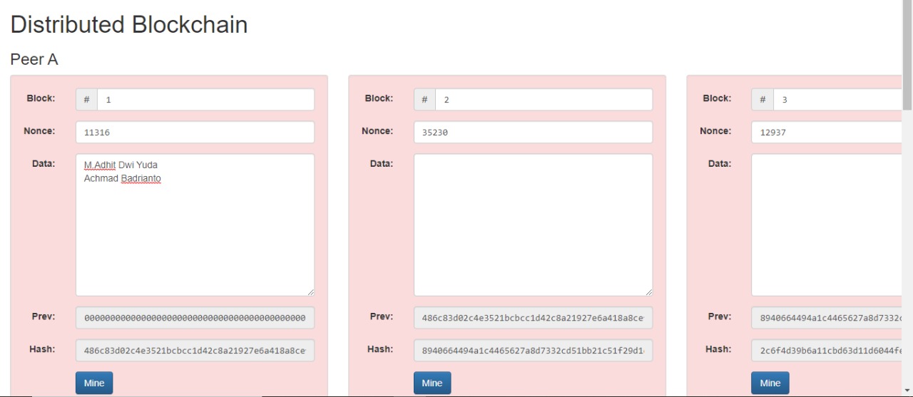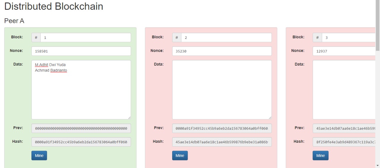 Setelah di isi, hash pada Peer A block 1 adalah: 0000a91f34952cc45b9a6eb2da156783064a0bff060a810baa4ea1645576aad6