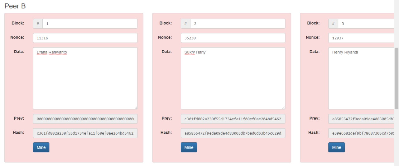 kemudian badri mengisi semua block yang ada di Peer B dan mendapatkan masing masing hash yang belum di mine.