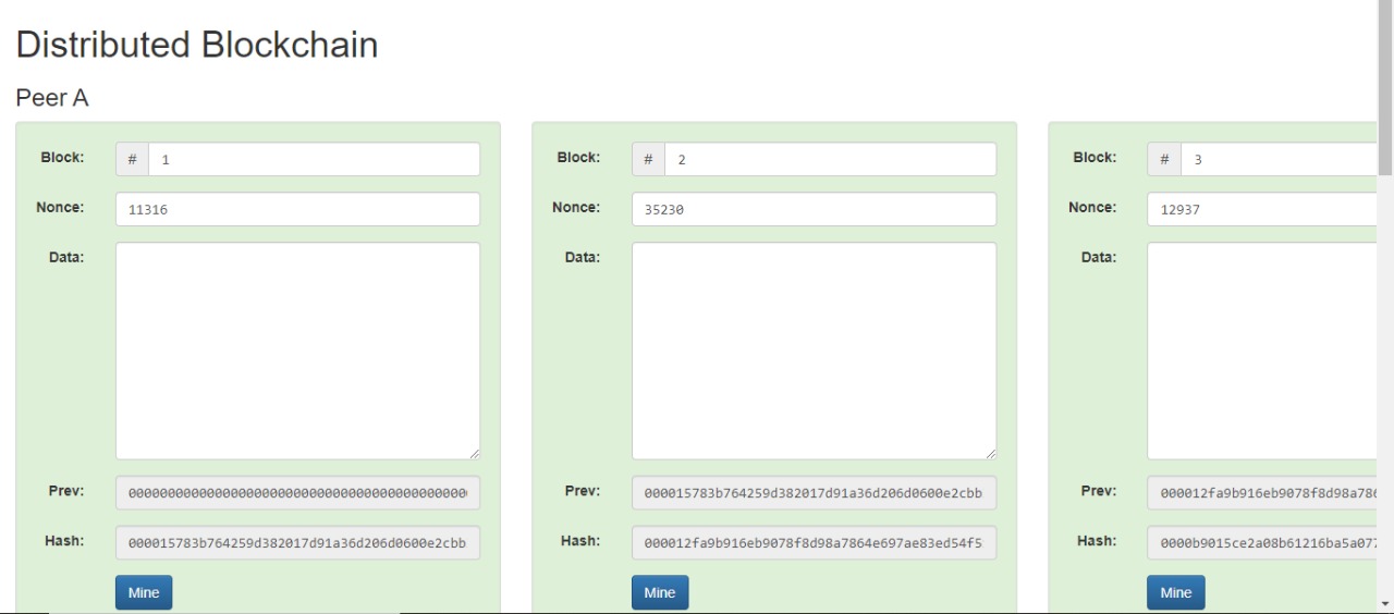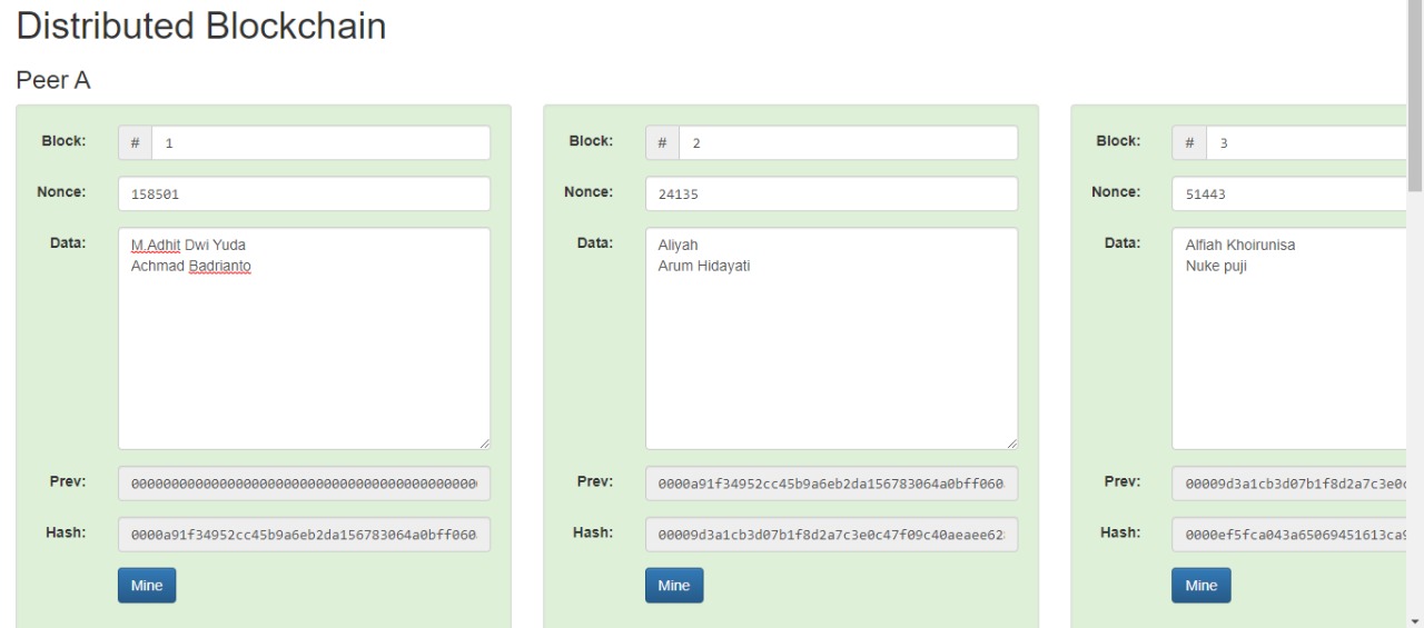 - Didalam menu Distributed, isikan nama dari teman masing masing, sama persis seperti yang ada di tantangan nomor 3, masukan kedalam masing masing peer. didalam masing masing block terdiri dari minimal 2 nama. Pastikan semua block dalam keadaan hijau, yang artinya block tersambung dengan baik secara distributed.