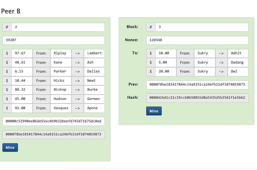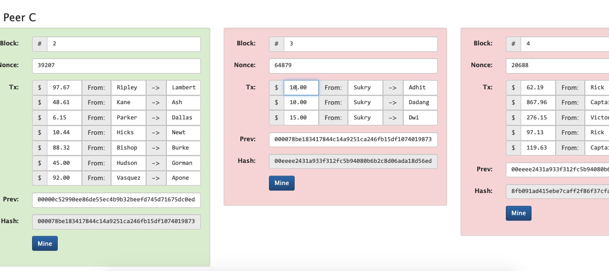 Saat nilai pada Peer C di rubah , maka rantai distributed terputus sehingga menampilkan warna merah pada Block . jika warna pada Block berwarna merah, maka perlu dilakukan mining kembali untuk menampilkan Block warna hijau.