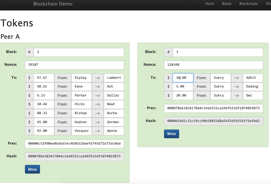 5. Pada menu Tokens, masukan transaksi dengan teman masing masing dengan nilai transaksi yang sesuai dengan yang diinginkan (apa saja boleh), perhatikan dan catat Nonce dan hash yang terbentuk.