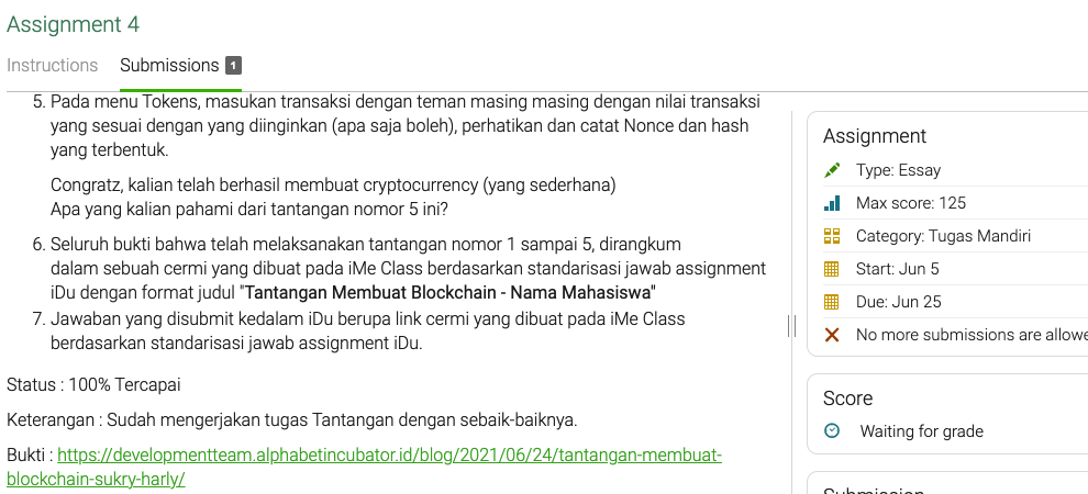 Apa yang kalian pahami dari tantangan nomor 5 ini? - Seluruh bukti bahwa telah melaksanakan tantangan nomor 1 sampai 5, dirangkum dalam sebuah cermi yang dibuat pada iMe Class berdasarkan standarisasi jawab assignment iDu dengan format judul “Tantangan Membuat Blockchain – Nama Mahasiswa”