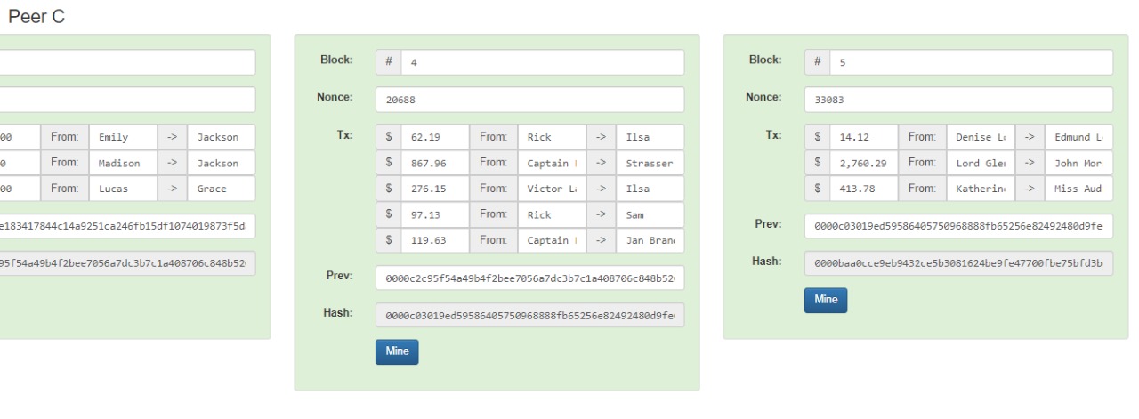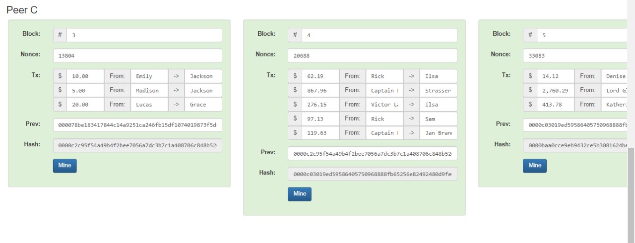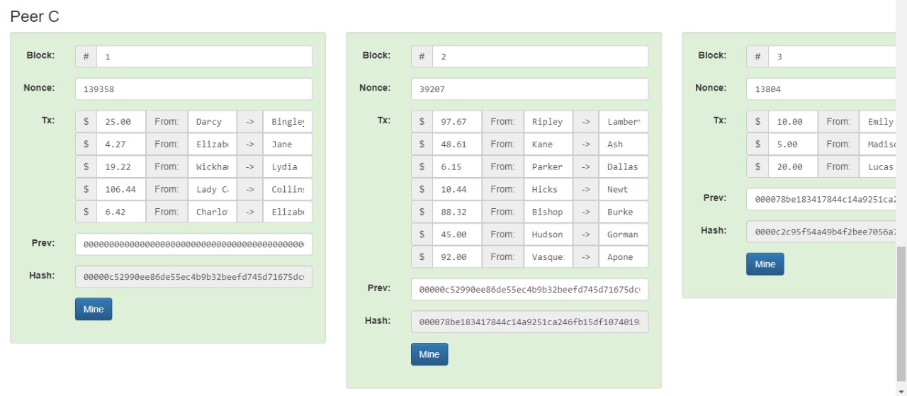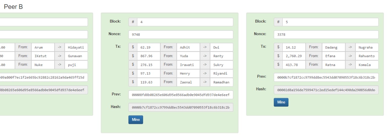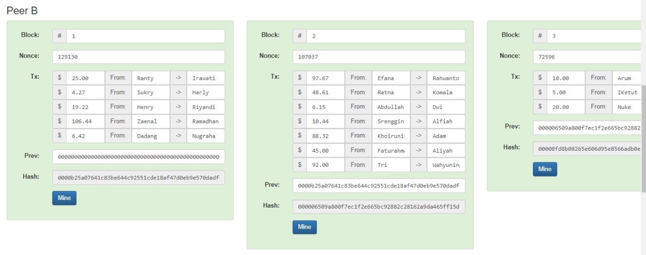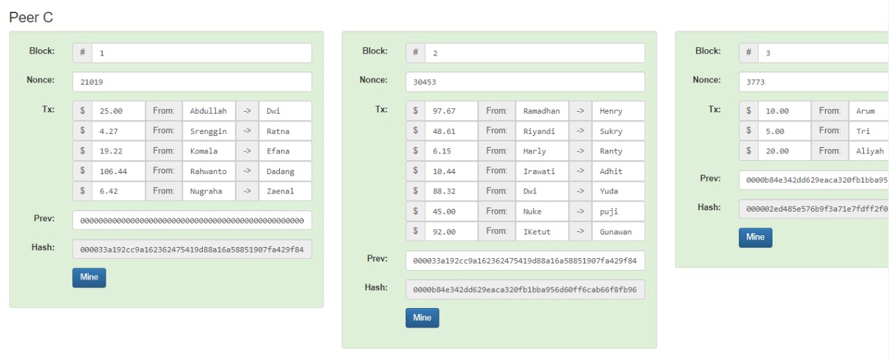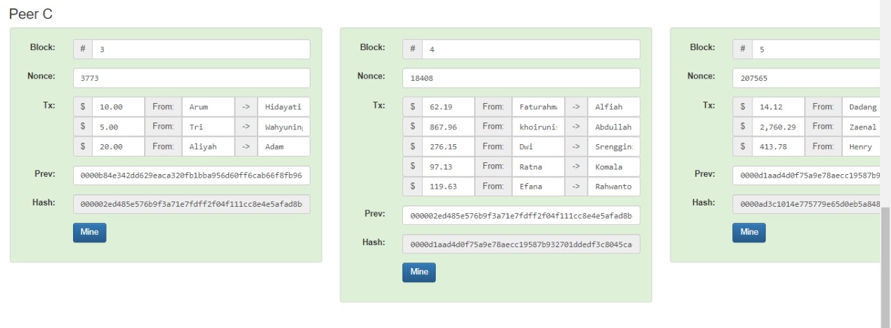 setelah itu, langsung badri klick tombol mine, dan sekarang peer C semua terhubung dari Block 1 sd 5.