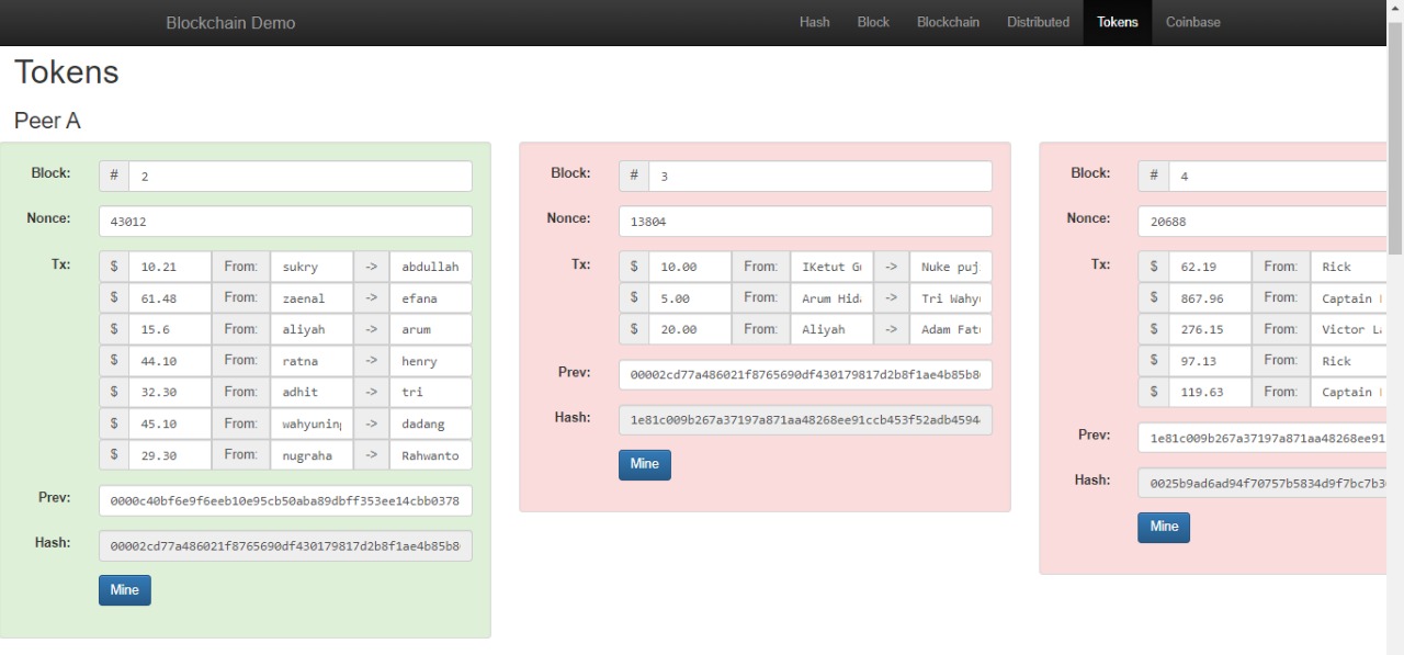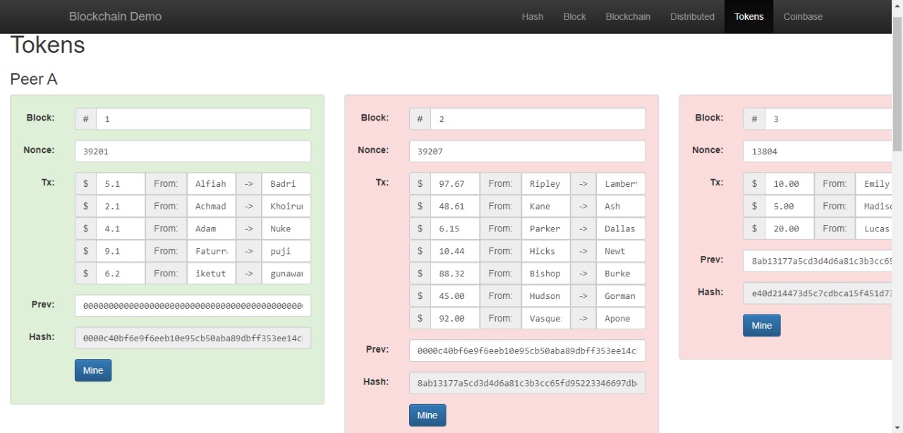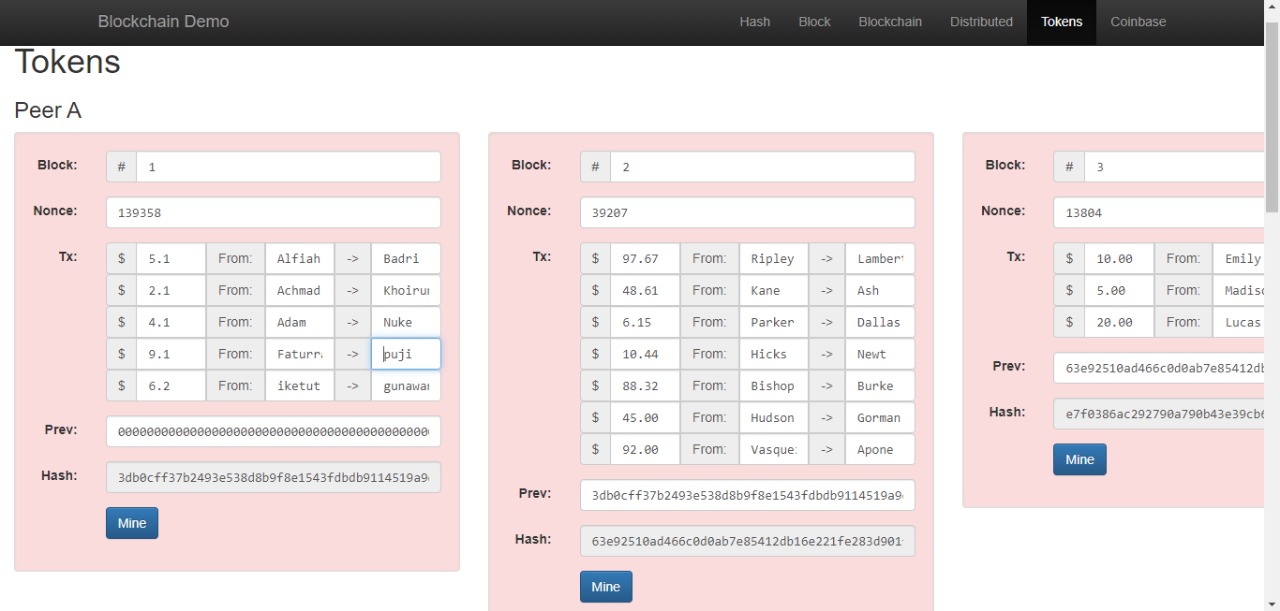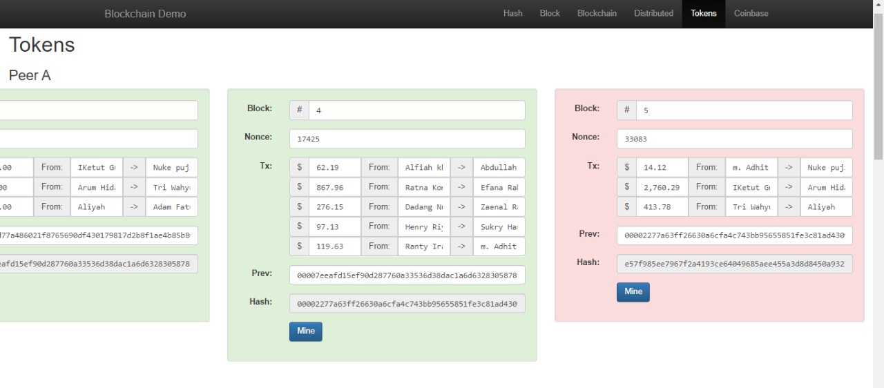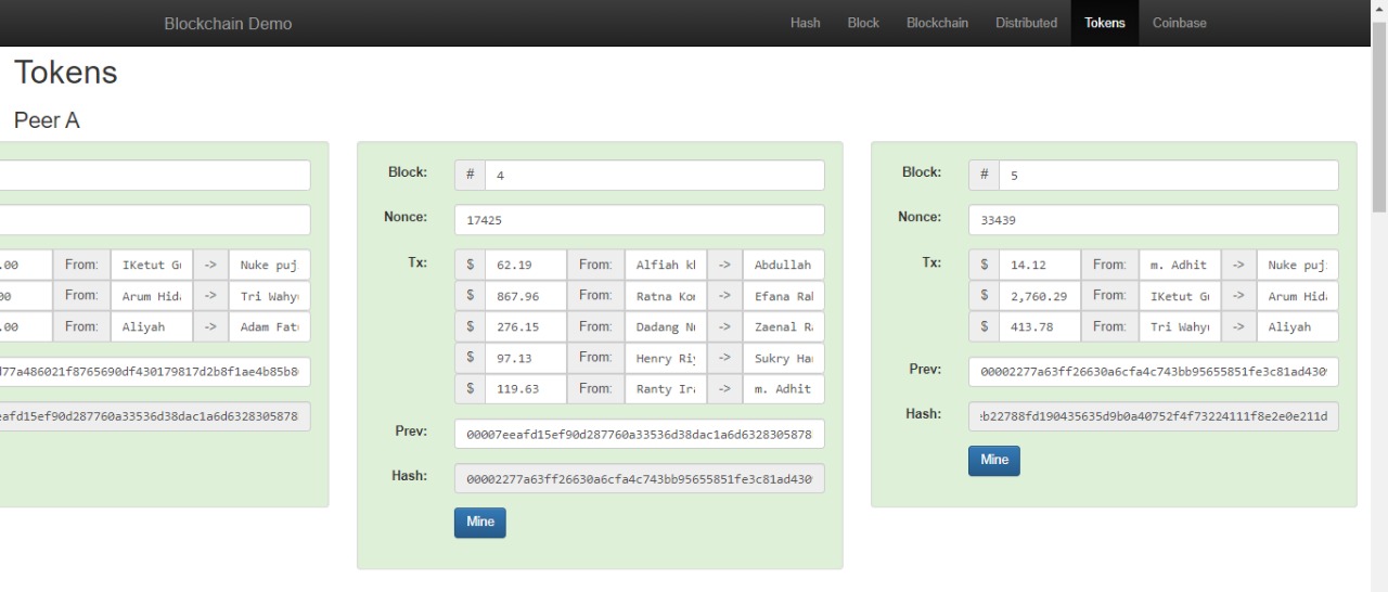 5. Pada menu Tokens, masukan transaksi dengan teman masing masing dengan nilai transaksi yang sesuai dengan yang diinginkan (apa saja boleh), perhatikan dan catat Nonce dan hash yang terbentuk.