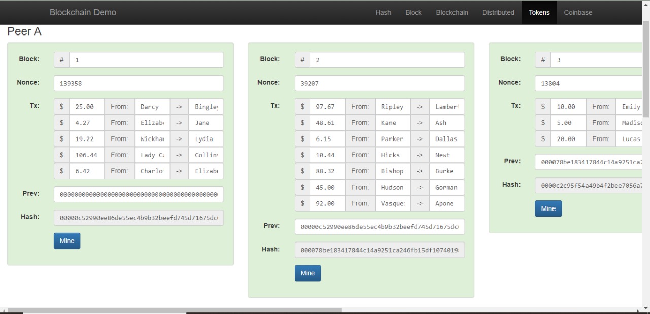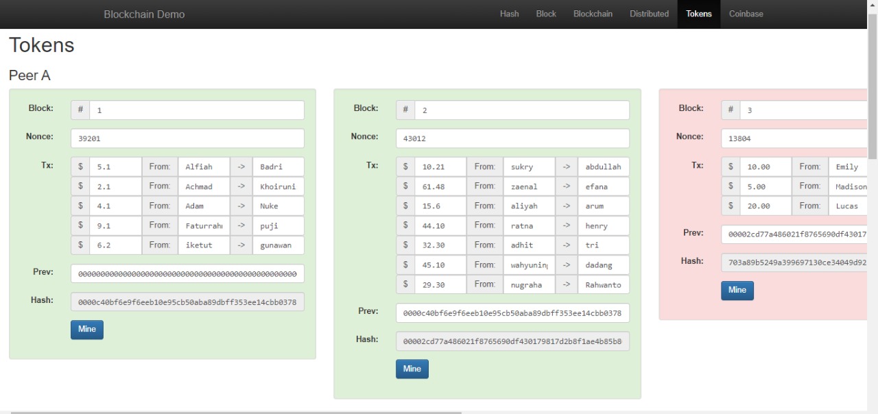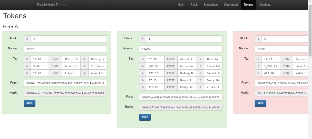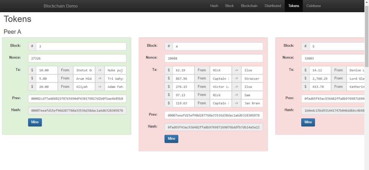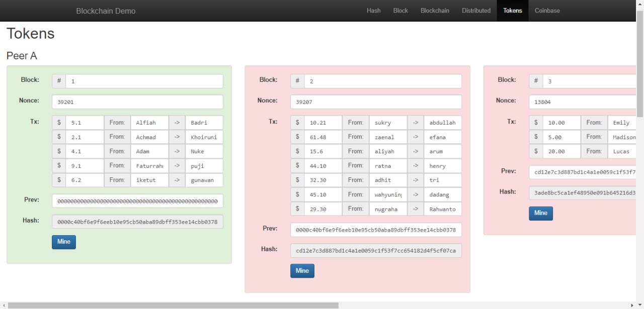 5. Pada menu Tokens, masukan transaksi dengan teman masing masing dengan nilai transaksi yang sesuai dengan yang diinginkan (apa saja boleh), perhatikan dan catat Nonce dan hash yang terbentuk.