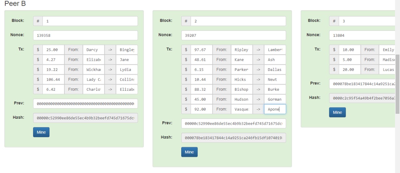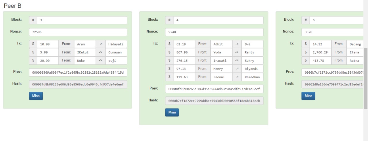 diatas adalah tampilan dari peer awal sebelum di masukkan data, blcok masih dalam keadaan hijau, semua masih terhubung, kemudian badri masukkan semua data menggunakan data nama MTI 12 seperti gambar dibawah ini, langsung badri klick tombol mine untuk menghubungkan satu sama lain.